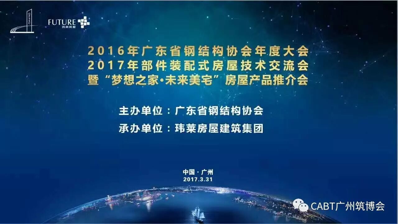 由中國鋼結構協會冷彎型鋼分會、廣東省鋼結構協會、廣東現代建筑工業化產業技術創新聯盟、廣州縱覽會展有限公司等單位聯合舉辦的“2017廣州先進建筑技術與建筑工業化博覽會”簡稱:中國筑博會(英文縮寫:CABT)定于2017年9月10-12日在廣州廣交會琶洲展館舉行,展會將同期舉辦“2017中國國際裝配式建筑高峰論壇”(主題論壇)、“第二屆中國國際冷彎型鋼博覽會”等展覽及會議,旨在推動建筑裝配化、集成化、工業化,促進行業技術交流和先進建筑技術的大力發展。