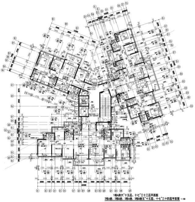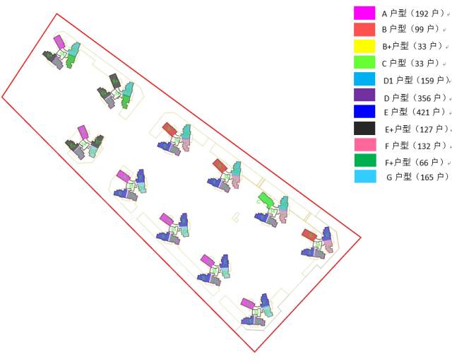 項目11棟住宅塔樓,有六種樓型,1棟A座、2棟A座、2棟B座、3棟A座、3棟B座五棟塔樓的樓型和標準層平面相同,2棟C座、2棟D座兩棟塔樓的樓型和標準層平面相同,1棟B座、1棟C座、3棟C座、3棟D座四棟塔樓的樓型和標準層各自不同。