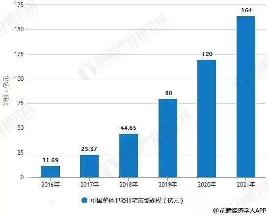 數據來源:前瞻產業研究院整理 中國整體衛浴行業迎來了新機遇 整體衛浴起源于20世紀50年代日本東京承辦奧運會時,為縮短工期,短時間建造大規模配套住宅設施。此后的大阪世博會以及政府出臺的相關規范和標準為整體衛浴的實踐、反饋和推廣流通提供了平臺。至今,日本超過90%的賓館、醫院和住宅采用整體衛浴,而美國、澳洲和歐洲等發達國家整體衛浴的需求也在不斷增大。 我國自20世紀90年代提出住宅產業化概念,明確住宅部品體系重要性后,于2006年出臺、2011復審修改出臺《住宅整體衛浴》(JG/T183—2011),2016年開始實施國家標準《工業化建筑評價標準》(GB/T51129—2015),將整體衛浴即集成式衛生間作為評價項目參與評分。 目前國內已有的整體衛浴主要應用于B端客戶,應用場景主要包括經濟型酒店、長租公寓、公租房和保障房等政策性保障房。在現有應用場景中,整體衛浴對于長租公寓和政策性保障房最為契合,伴隨用戶使用習慣、裝修設計等方面的提升,未來整體衛浴將逐漸普及到精裝修住宅。 因此,盡管進程緩慢,但在國家強力推進建筑產業化、裝配式建筑的大潮中,整體衛浴行業迎來了新機遇。據統計數據顯示,截止至2018年中國整體衛浴市場規模增長至47.23億元,其中中國整體衛浴住宅市場規模達到了44.65億元,預測2020年中國整體衛浴市場規模突破百億元。根據全裝修、整裝衛浴和裝配式建筑的數量關系預測,到2021年中國整體衛浴市場規模將達173億元,其中住宅市場規模將達164億元。 2016-2021年 中國整體衛浴市場規模統計情況及預測